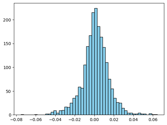 plt.hist(np.log(stock_data["close"])-np.log(stock_data["open"]), bins=50, color="skyblue", edgecolor="black")